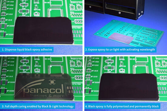 With the new “Black&Light” technology from Panacol black adhesives can now be cured in deeper layers up to a few millimeters with uv light. During the curing process, the “Black & Light” technology within the adhesive enables the UV rays to penetrate and complete a full cure. Once the adhesive polymerization is complete, the structure of the "Black & Light" technology prohibits light transmission. Thus, black adhesives with high optical density can now be cured in a single curing step with uv light only. This process is irreversible.